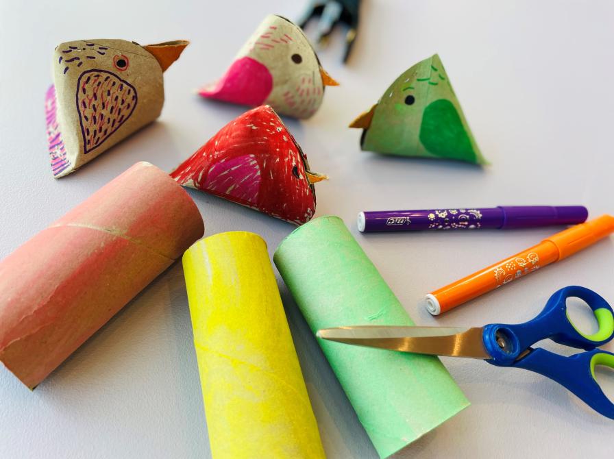 Vi har fyldt bibliotekets krea-borde med alt, man behøver, for at lave sine helt egne flotte fugle.